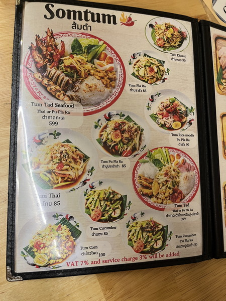 ソムタムタイやパラーなどの定番から、キュウリのソムタムなど珍しいもの、そしてラオスでも人気の麺入りのソムタムもあった!