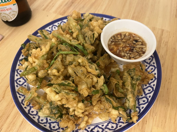 空心菜のフリットは一度食べて見たかったメニュー。揚げてありますが野菜なのでヘルシーと信じて食べています。想像通りビールに合う。