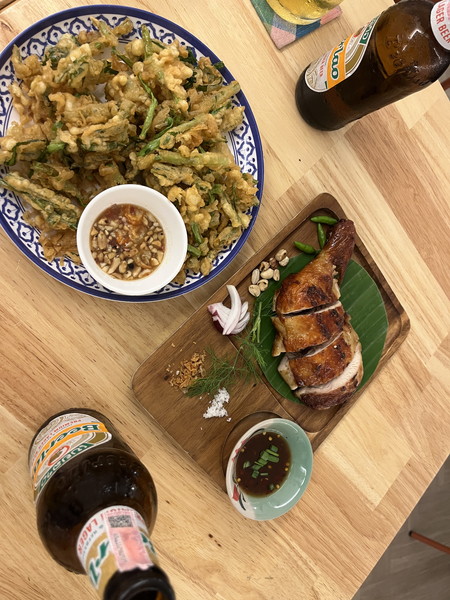 この日は2名で訪れ、ソムタムタイ、空心菜のフリット、ガイヤーン、そしてカオニャオを1人ひとつずつ注文しました。