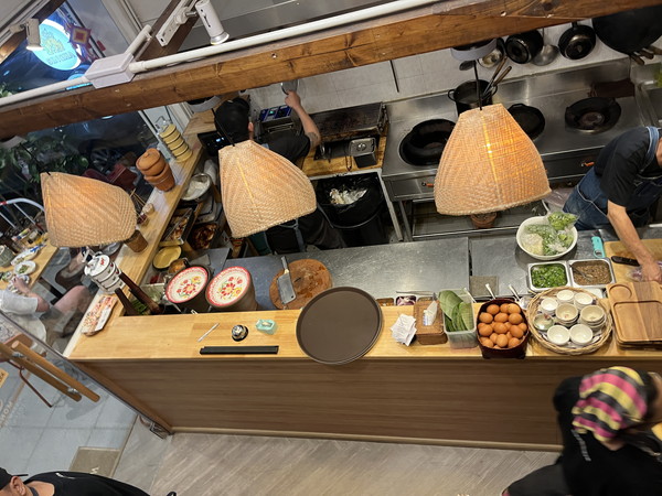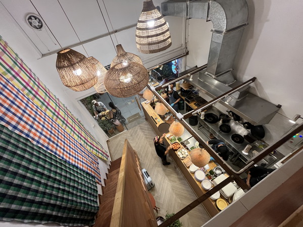 お店の階段にはイサーンの工芸品であるパーカオマー(かわいいチェックの布)が飾られていて、上から見下ろした景色が可愛い。